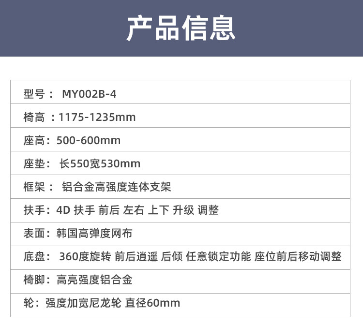 框架 : 铝合金高强度连体支架 表面:韩国高弹度网布