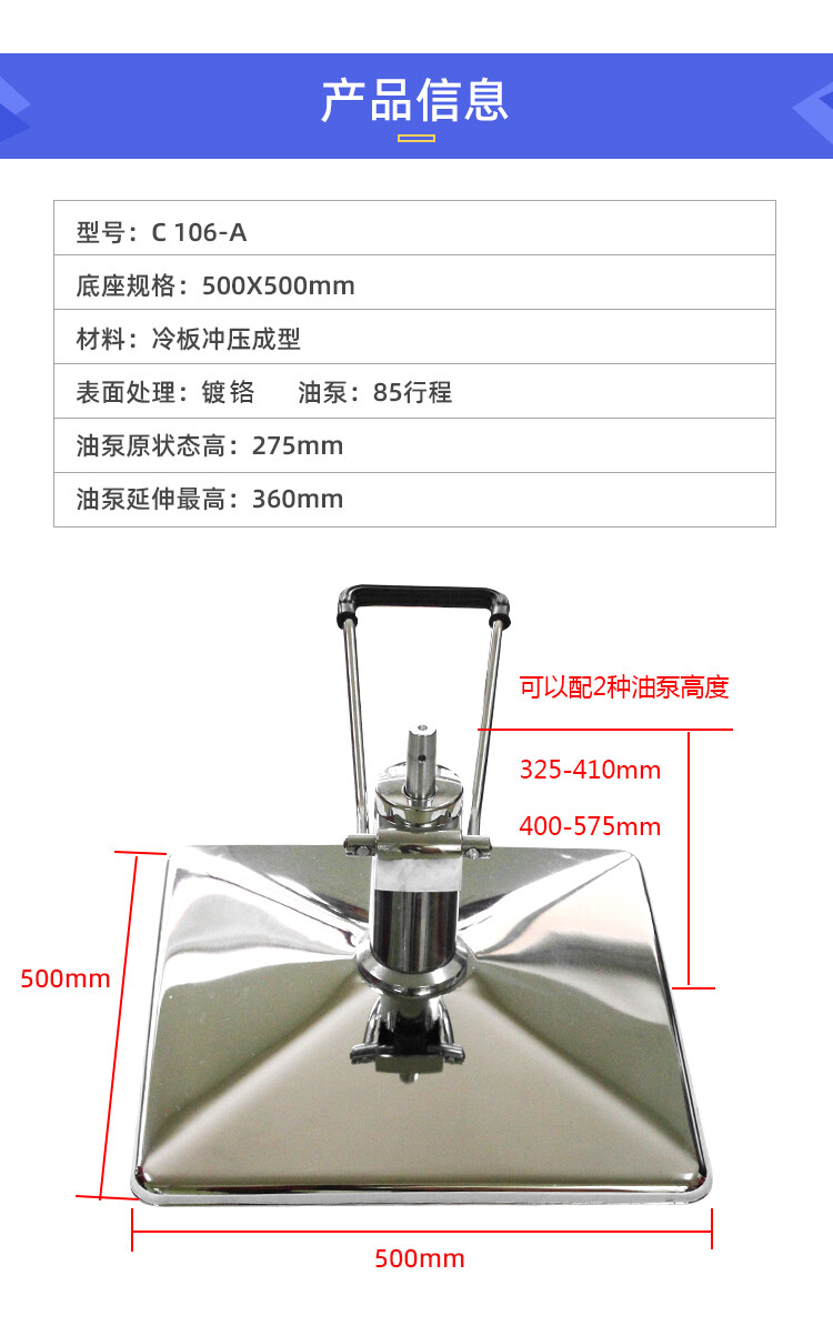 底座规格:500X500mm 油泵:85行程 油泵原状态高:275mm 油泵延伸最高:360mm