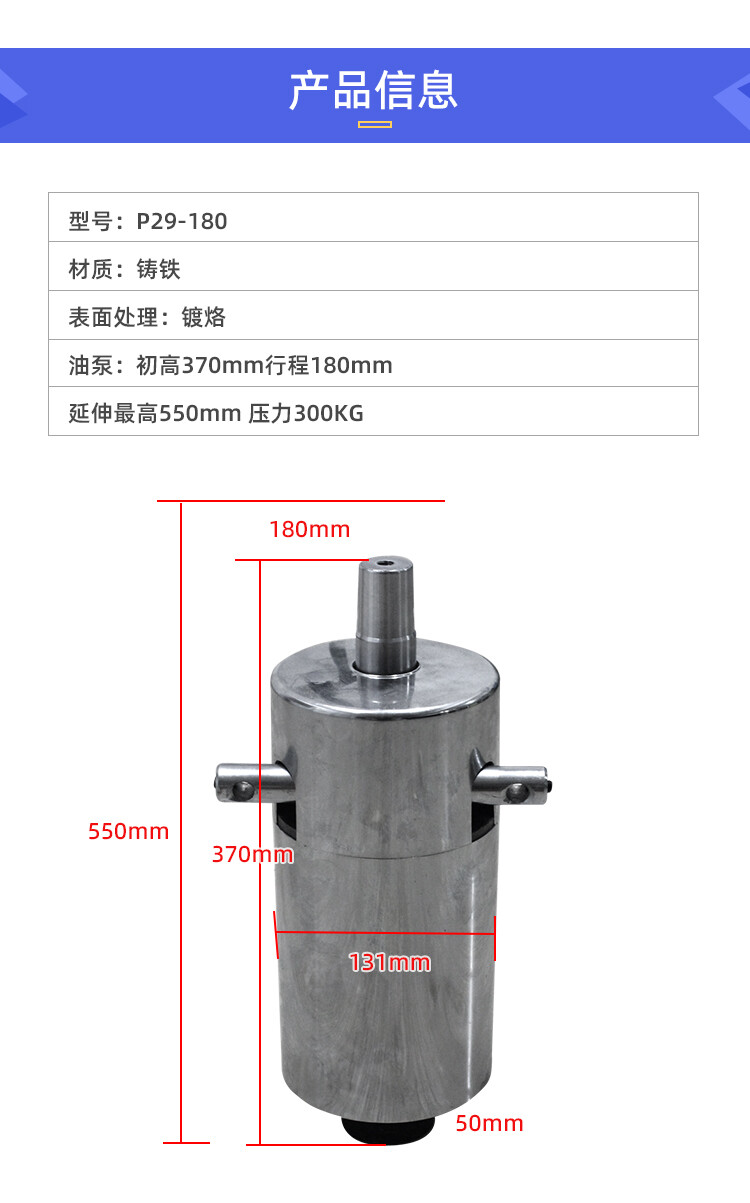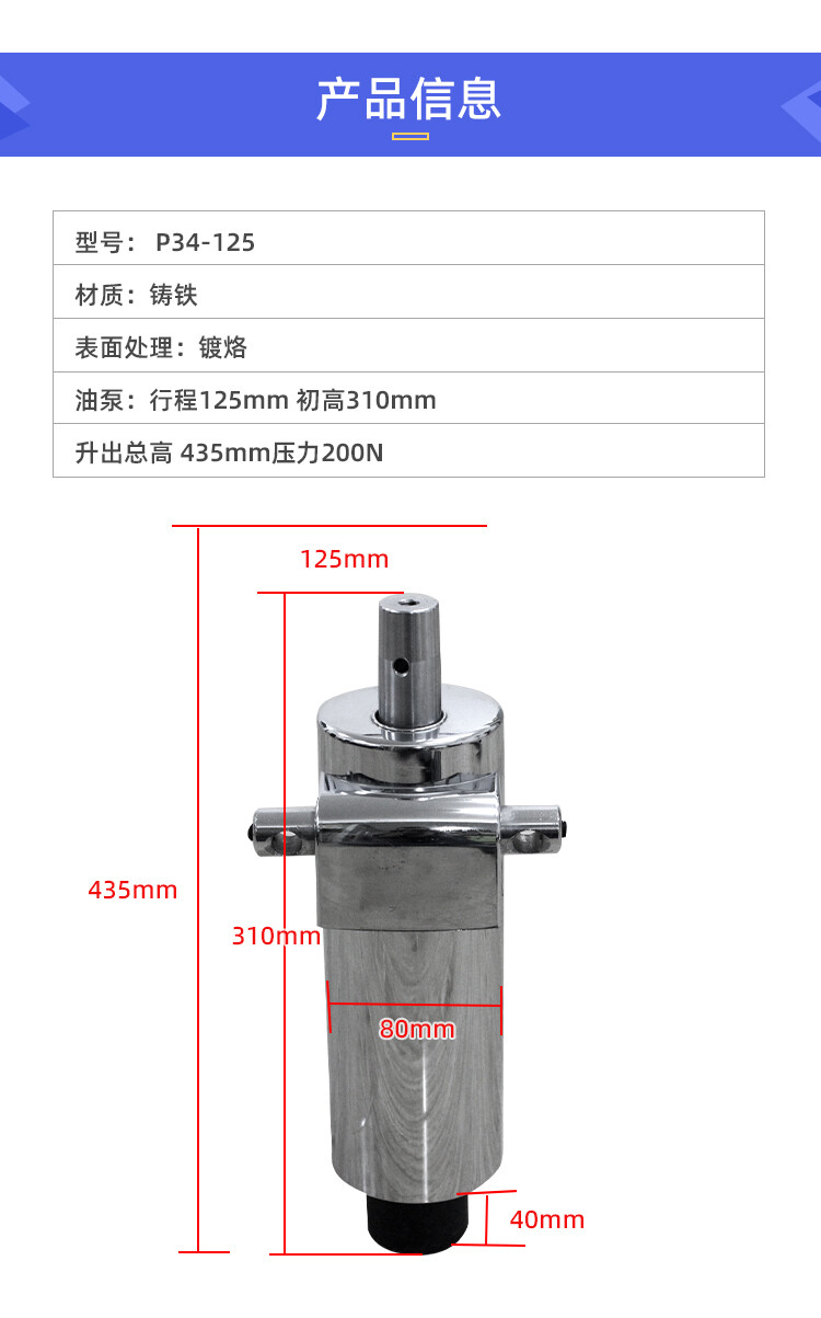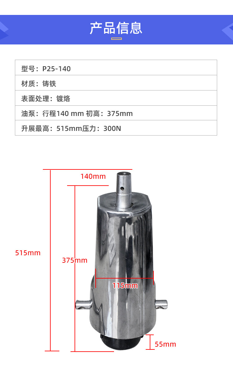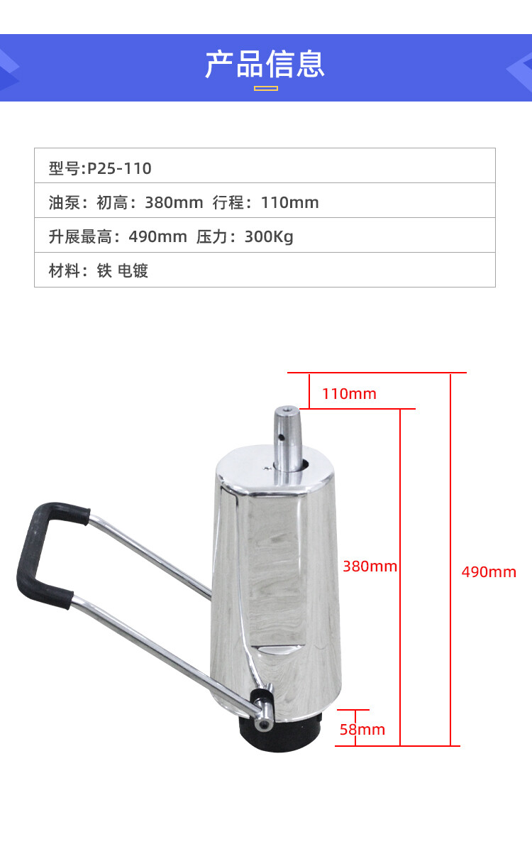 油泵:初高:380mm 行程:110mm 升展最高:490mm 压力:300Kg (还有很多规格 这个仅此参考)