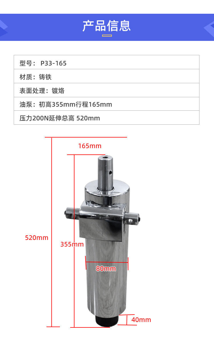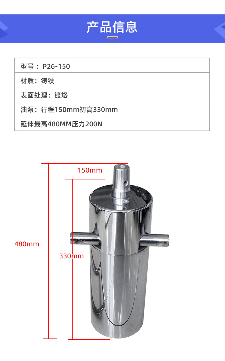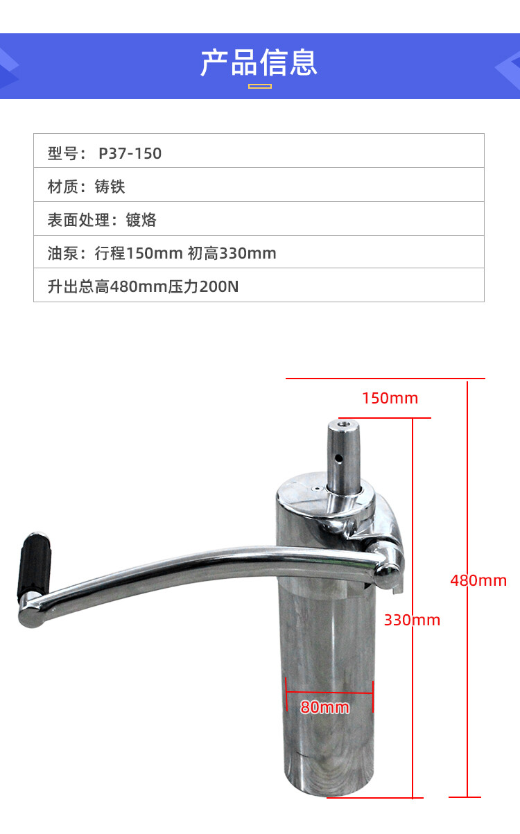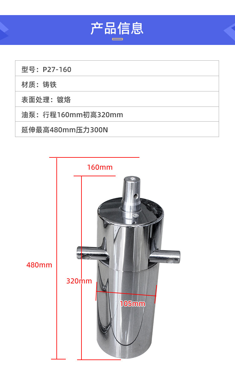 油泵:初高:380mm 行程:110mm 升展最高:490mm 压力:300Kg (还有很多规格 这个仅此参考)