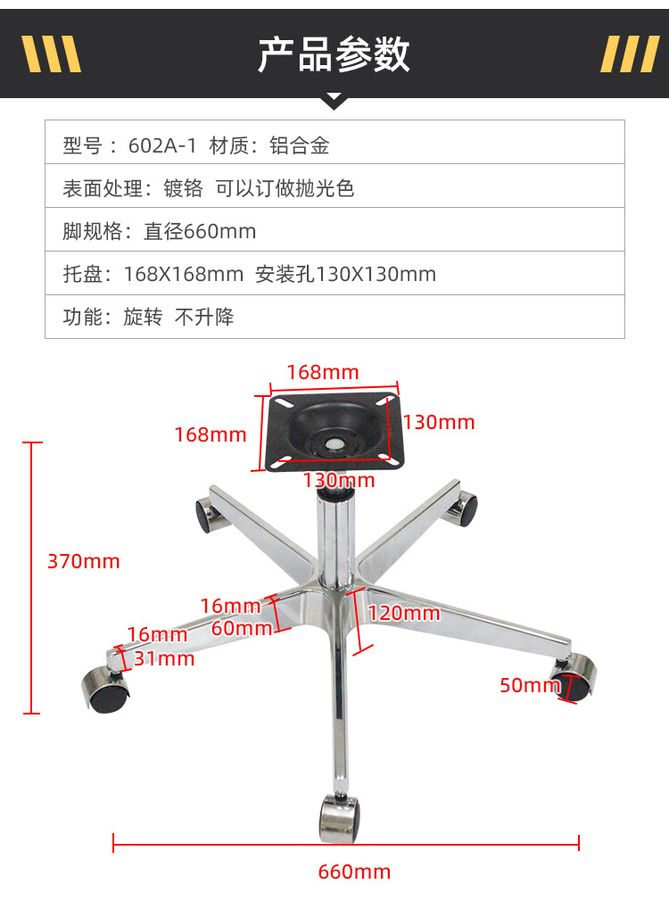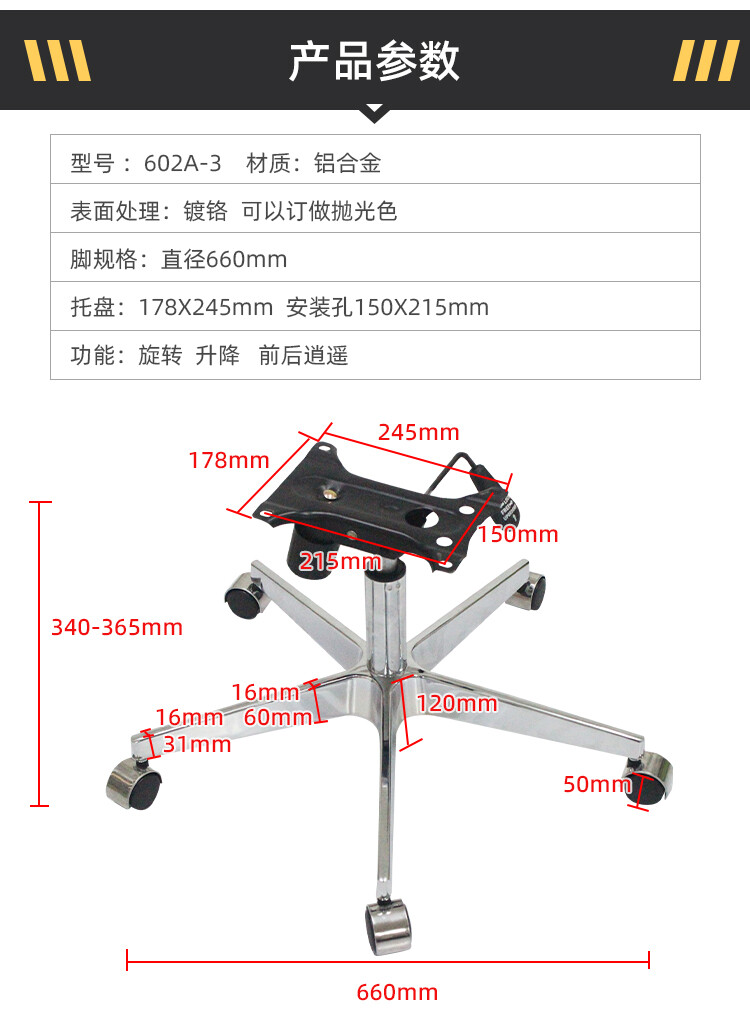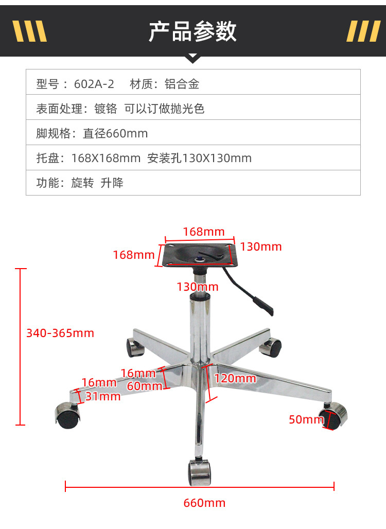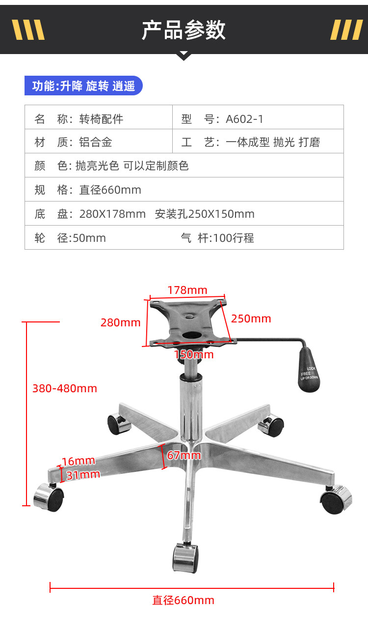 脚直径660mm 底盘:280X178mm 安装孔250X150mm 轮径:50mm 气杆:100行程