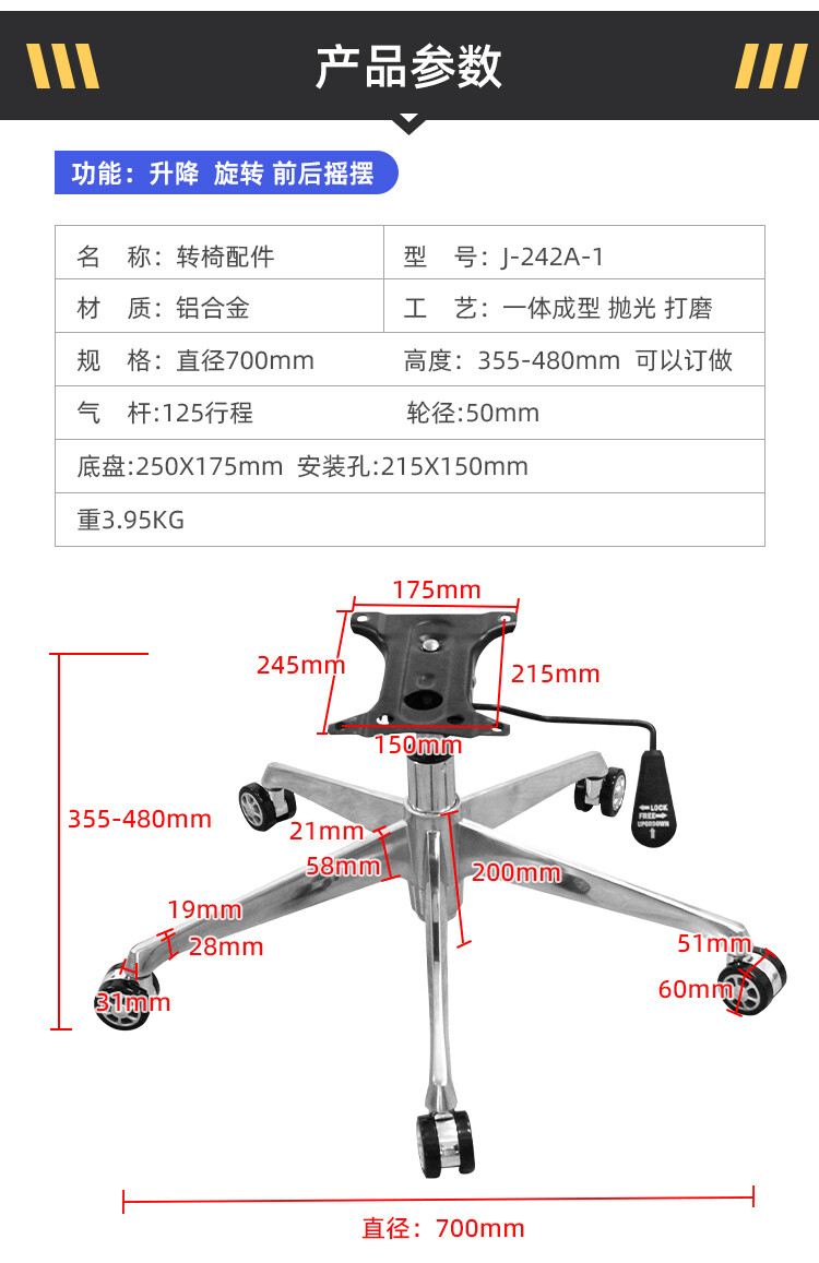 脚直径700mm 高度:355-480mm 可以订做 气杆:125行程 轮径:50mm 底盘:175X 250mm 安装孔:215X150mm
