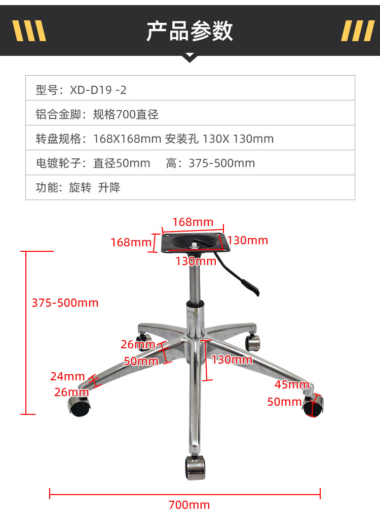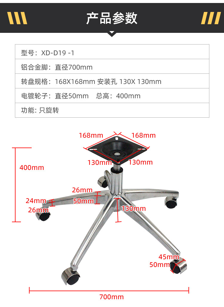 脚直径700mm 转盘:168X168mm 安装孔 130X 130mm 轮径50mm 总高:400mm 能订做高度